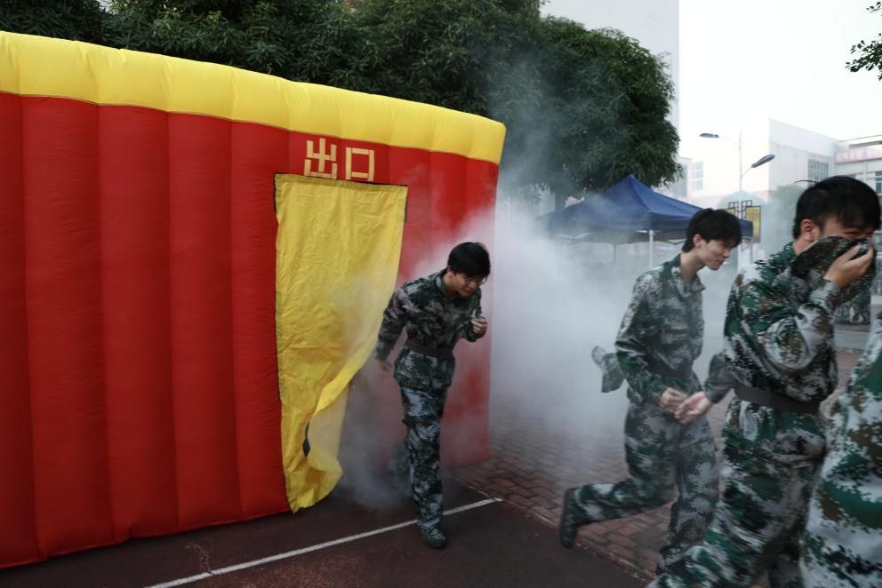 中午14:30,疏散演練開始,學(xué)生公寓模擬起火點開始點煙,火災(zāi)警報聲立即拉響。各公寓樓從高到低逐層疏散,在引導(dǎo)員的指引下,全體師生用毛巾捂住口鼻,沿著疏散通道采用彎腰低頭的姿勢,有序地疏散至安全地帶。