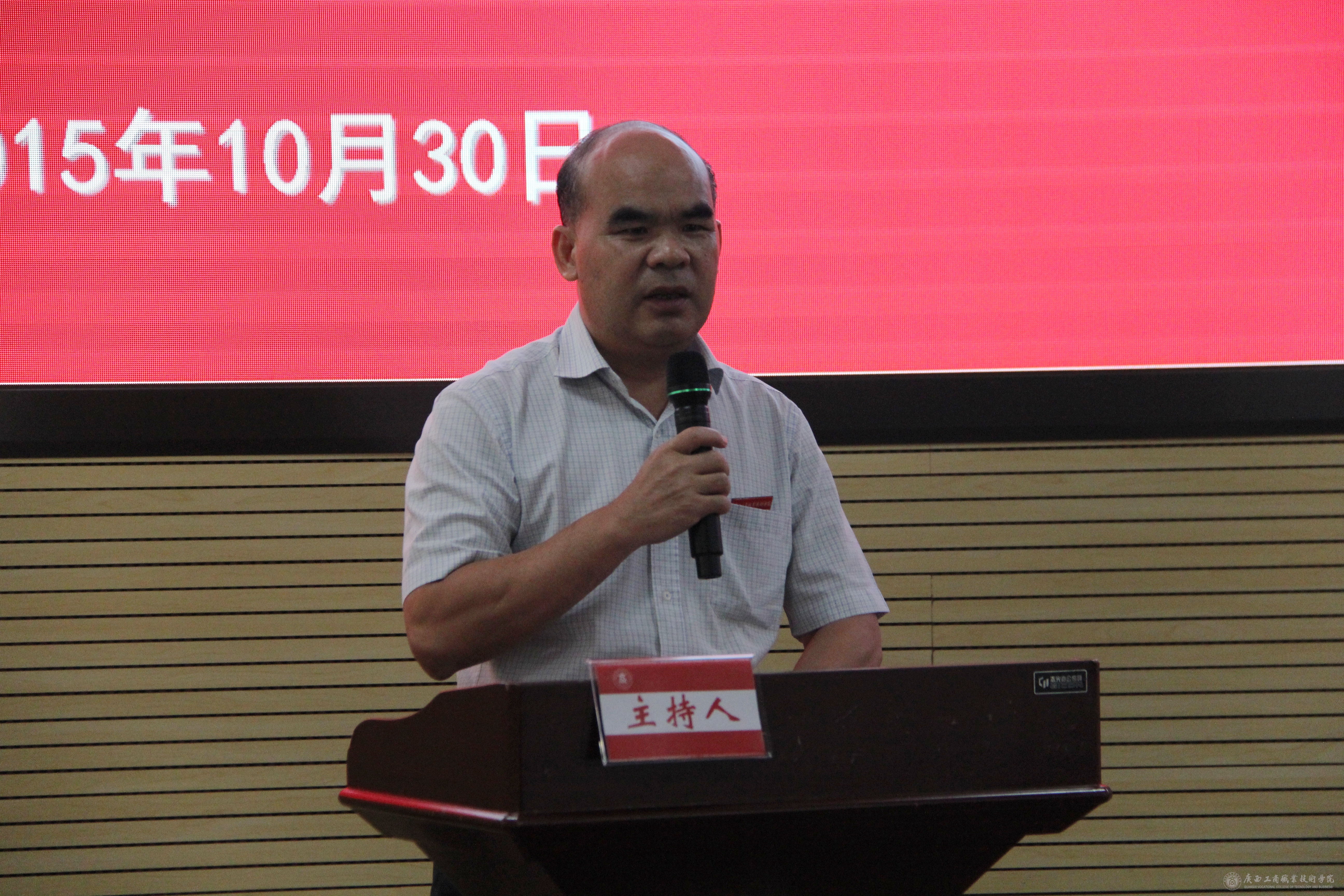 2015年10月30日下午,我院邀請(qǐng)自治區(qū)糧食局吳宇雄局長(zhǎng)作“三嚴(yán)三實(shí)”專(zhuān)題報(bào)告。報(bào)告會(huì)在我院校本部2119 會(huì)議室舉行。學(xué)院黨委書(shū)記覃武云、黨委副書(shū)記蒙啟成、副院長(zhǎng)李仕欽、副廳級(jí)調(diào)研員黃永蓬、自治區(qū)糧食局辦公室副主任朱其俊,以及我院副科級(jí)以上干部、社科部全體教職工和學(xué)生干部代表參加了報(bào)告會(huì),報(bào)告會(huì)由覃武云書(shū)記主持。