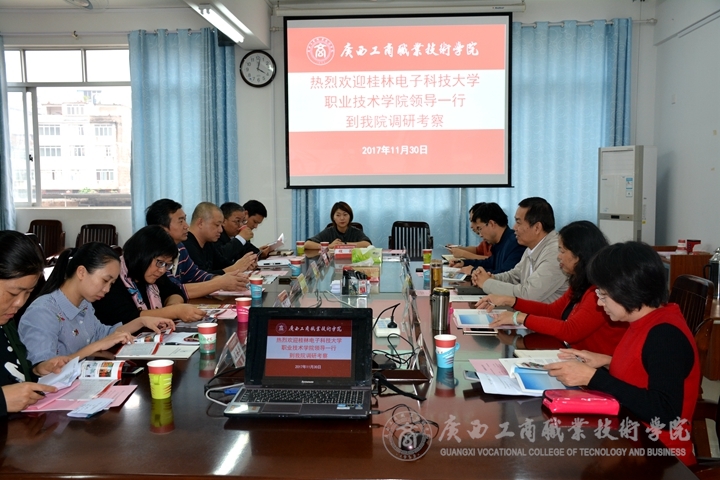 ? ? ? ? 11月30日下午, 桂林電子科技大學(xué)職業(yè)技術(shù)學(xué)院院長唐寧、副院長袁泉、副院長李曉記及教學(xué)口相關(guān)負(fù)責(zé)人前來我院交流,學(xué)院副院長李維率我院教學(xué)口相關(guān)負(fù)責(zé)人熱情的接待了唐寧一行。