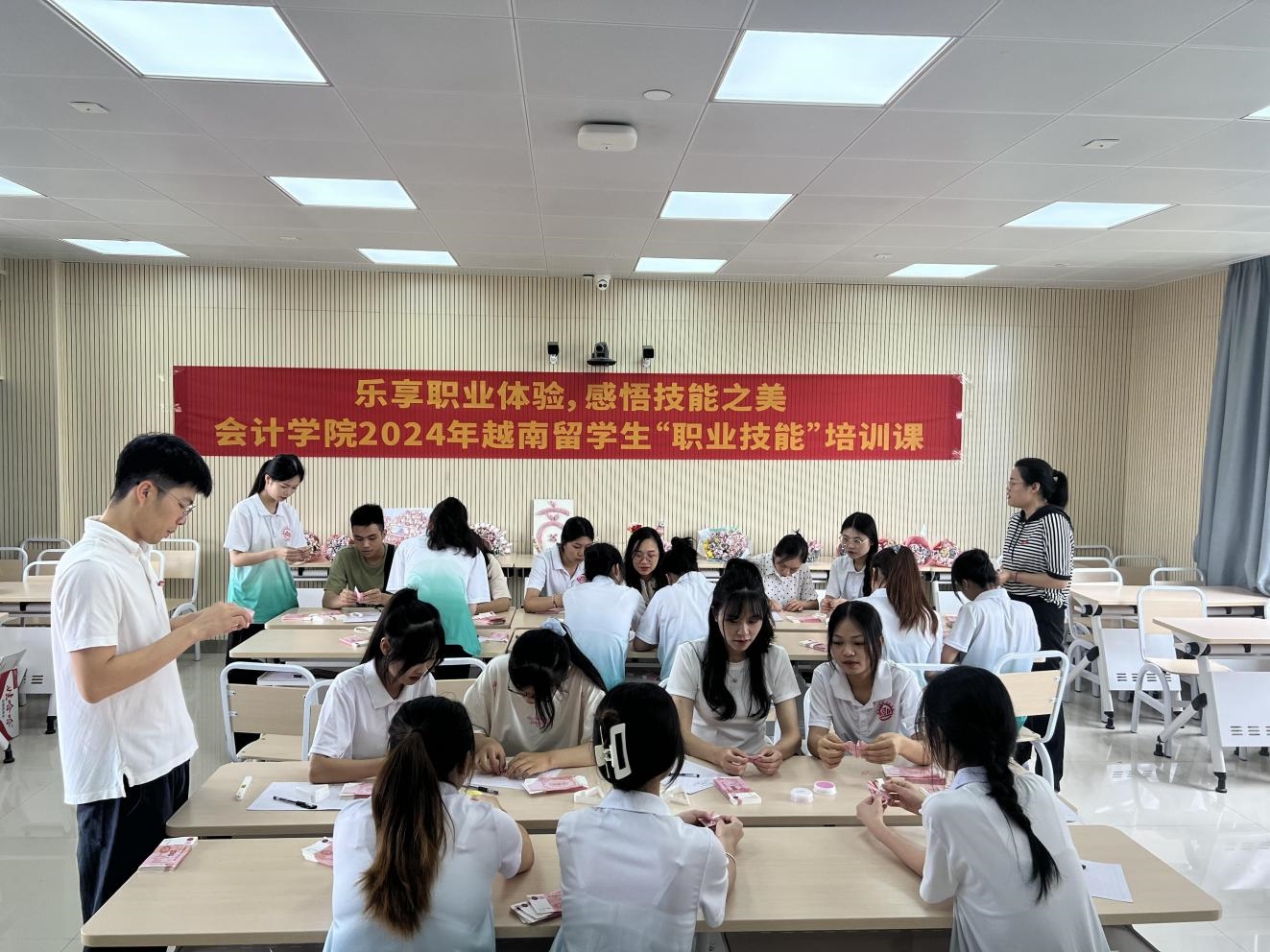 為貫徹落實(shí)“一帶一路”倡議,深入貫徹黨的二十大精神,更好地切實(shí)推進(jìn)加強(qiáng)與東盟國(guó)家的教育交流,推進(jìn)與東盟國(guó)家的職業(yè)教育合作,同時(shí)進(jìn)一步推進(jìn)學(xué)院國(guó)際交流相關(guān)工作。我院于6月26日在武鳴校區(qū)A2-305教室舉辦“樂(lè)享職業(yè)體驗(yàn),感悟技能之美”—— 2024年越南留學(xué)生混班研學(xué)培訓(xùn)課程。本次活動(dòng)旨在通過(guò)混班研學(xué),讓越南留學(xué)生深入體驗(yàn)中國(guó)會(huì)計(jì)職業(yè)的魅力,由我院鐘小林老師主講。